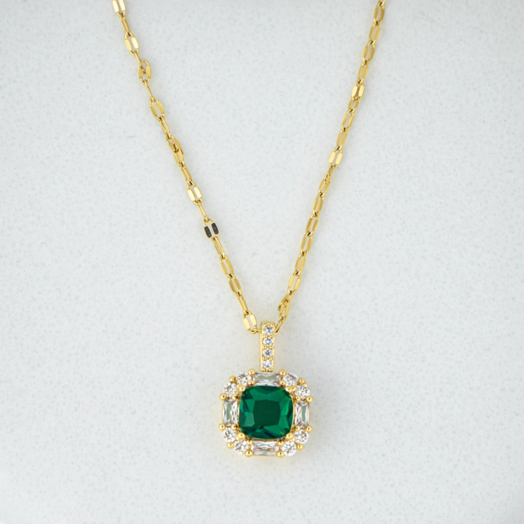 At the centre of the pendant lies a beautifully cut emerald green stone, surrounded by sparkling diamond-like cubic stones that create a stunning halo effect. The contrast between the deep green centre stone and the shimmering accents gives the pendant a premium and eye-catching appearance. The square-inspired shape with soft edges adds balance and elegance, making the design both classic and contemporary.