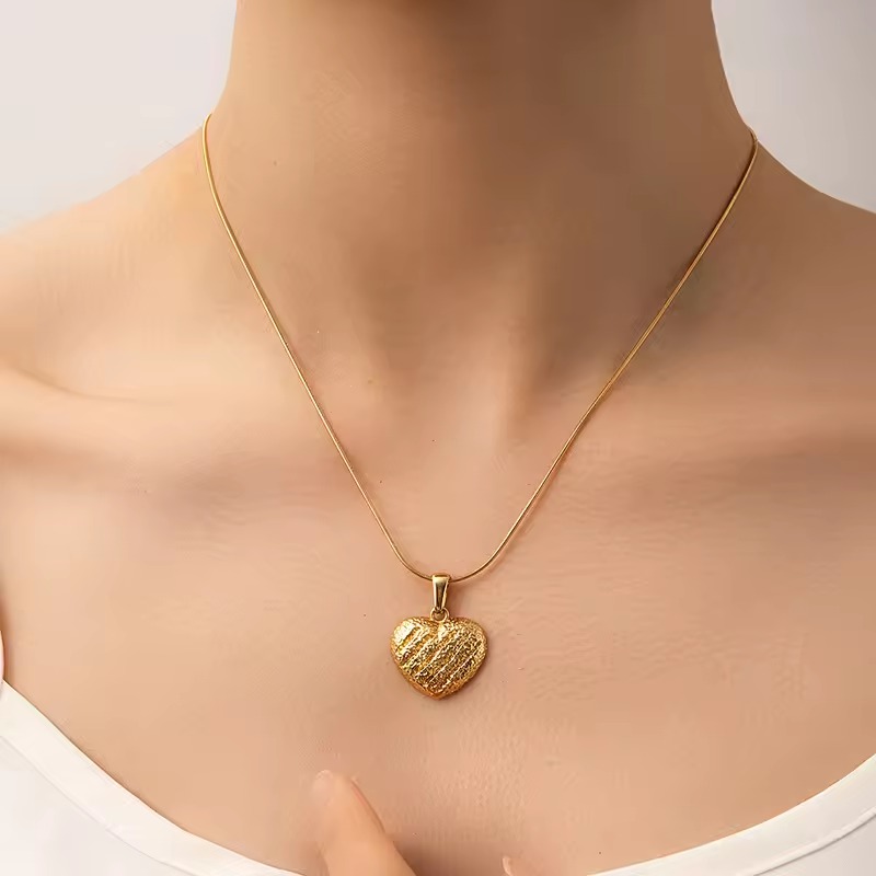The heart gold pendant necklace is a timeless jewellery piece designed to express love, elegance, and simplicity. This heart gold pendant necklace features a beautifully textured heart-shaped pendant crafted with premium stainless steel and finished with a rich gold plating for a luxurious look.
